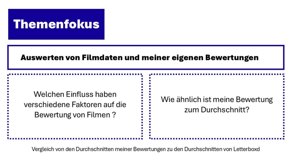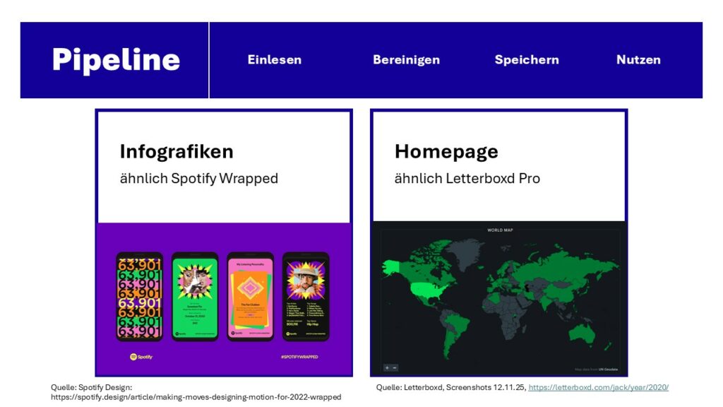 In diesem Projekt geht es darum, Daten nutzbar zu machen und anschließend zu präsentieren. Mein Konzept befasst sich mit der Auswertung von Daten einer Filmbewertungsplattform. Aus meinen eigenen Nutzerdaten und den verfügbaren Daten der Plattform sollen Infografiken erstellt werden. Im ersten Schritt wurden nun die Daten gesammelt und werden anschließend bereinigt.