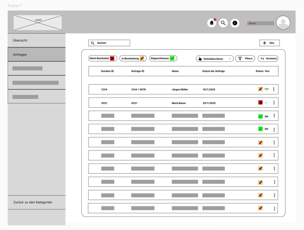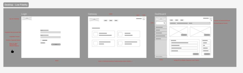 Um die Projektziele und -definitionen nun zu validieren, wurden Papier-Prototypen erstellt. Dabei sollten keine fertig gestalteten Oberflächen entstehen, sondern erste Ideen, die mit den Stakeholdern besprochen wurden, um die Zielsetzungen zu überprüfen.